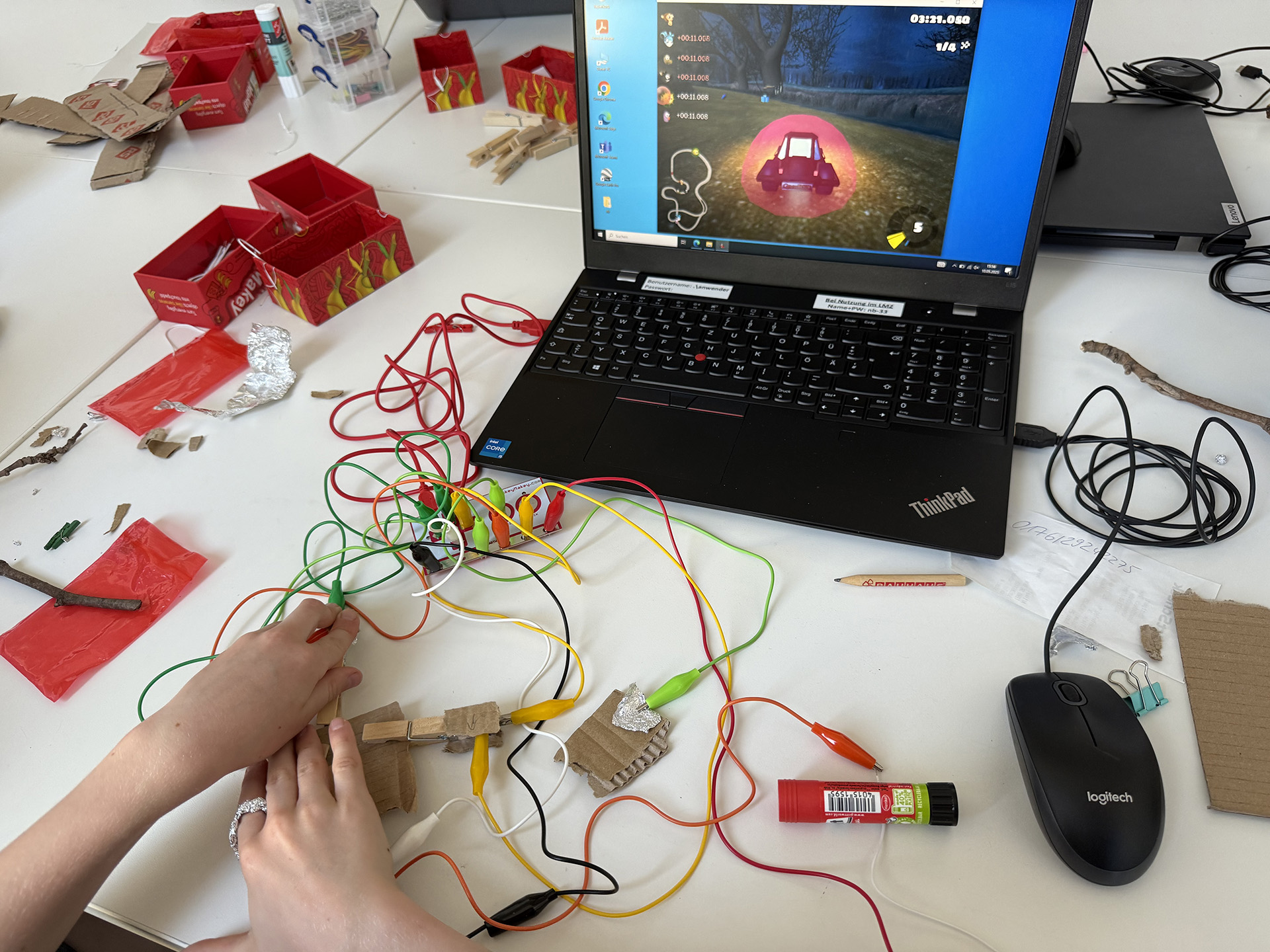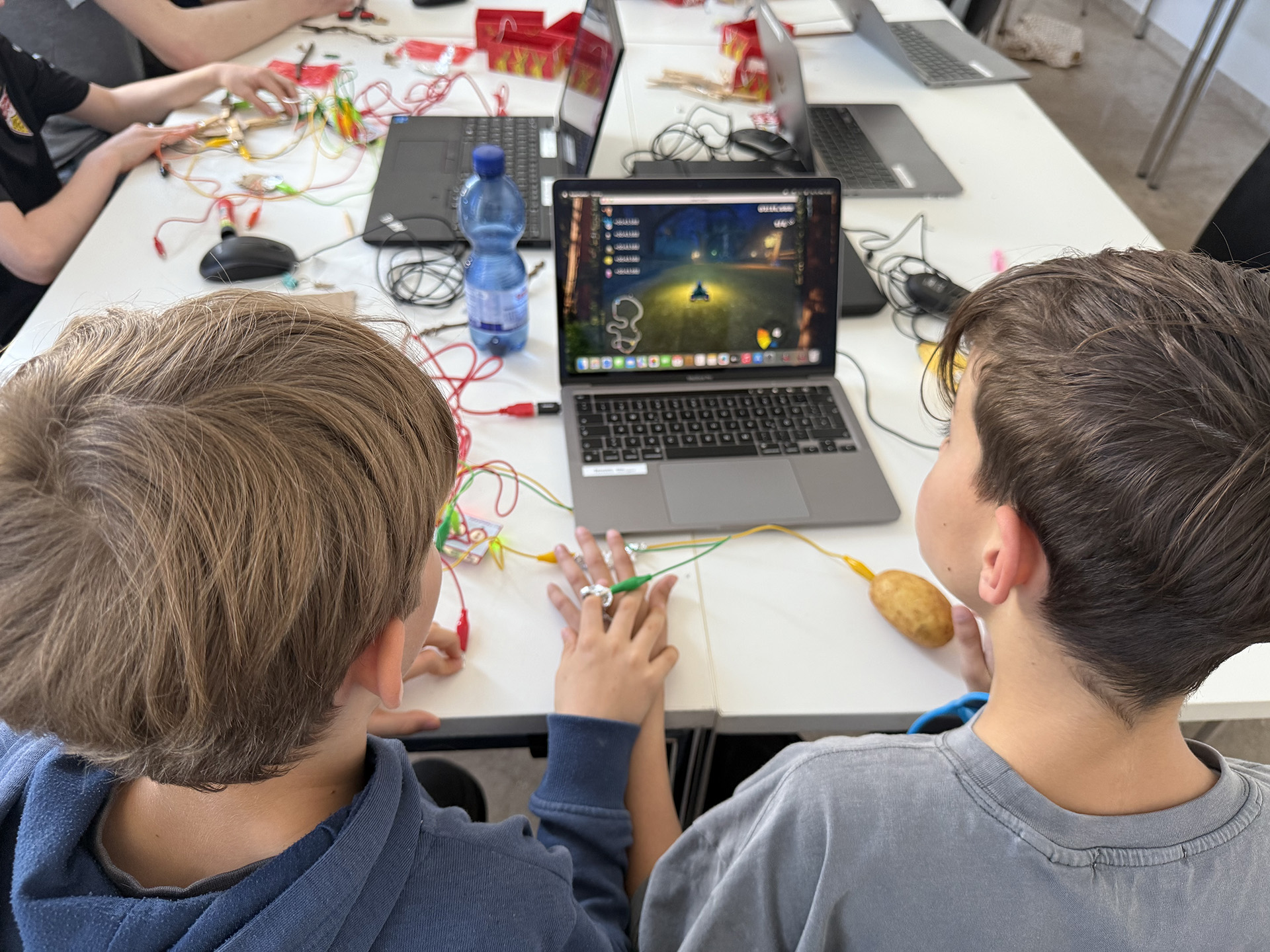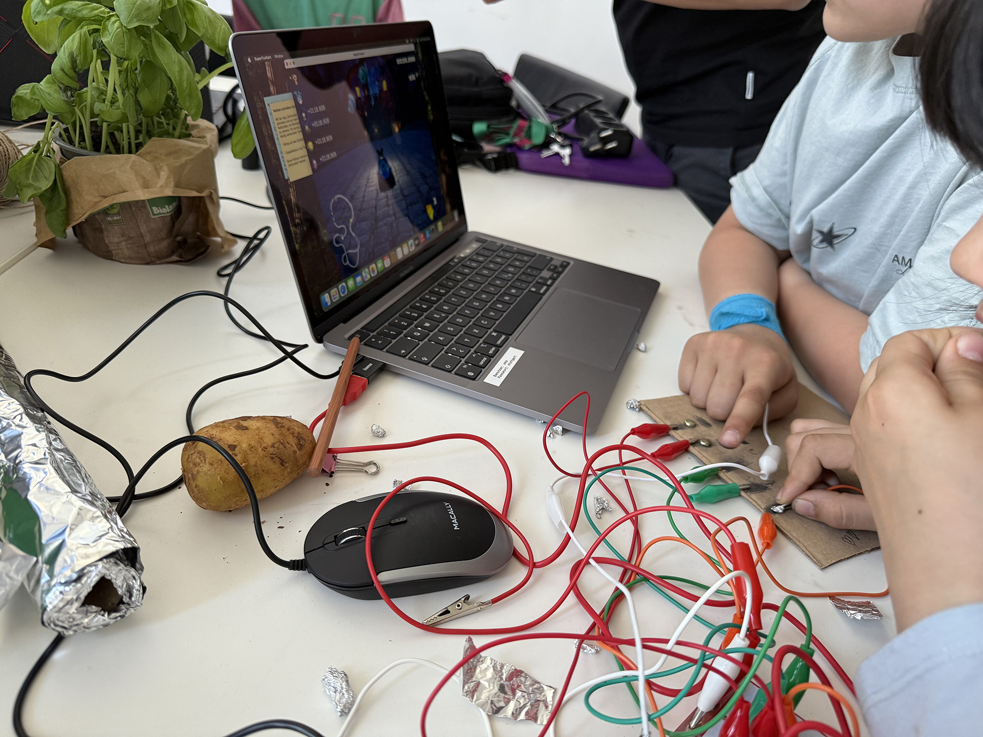Im MakeyMakey-Workshop konnte man kreativ werden und eigene Games-Controller aus alltäglichen Materialien bauen. Der Fantasie waren dabei keine Grenzen gesetzt! Egal ob Büroklammern, Aluknöpfe oder eine Kartoffel. Und am Ende wurden die Controller getestet und in einer Challenge zeigte sich, welche Team das war!