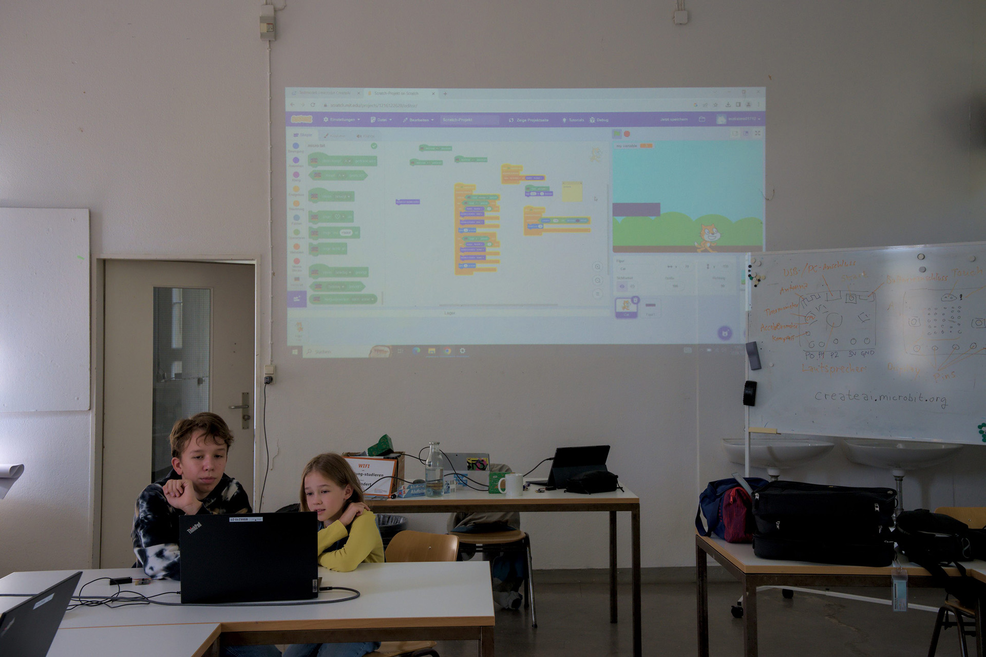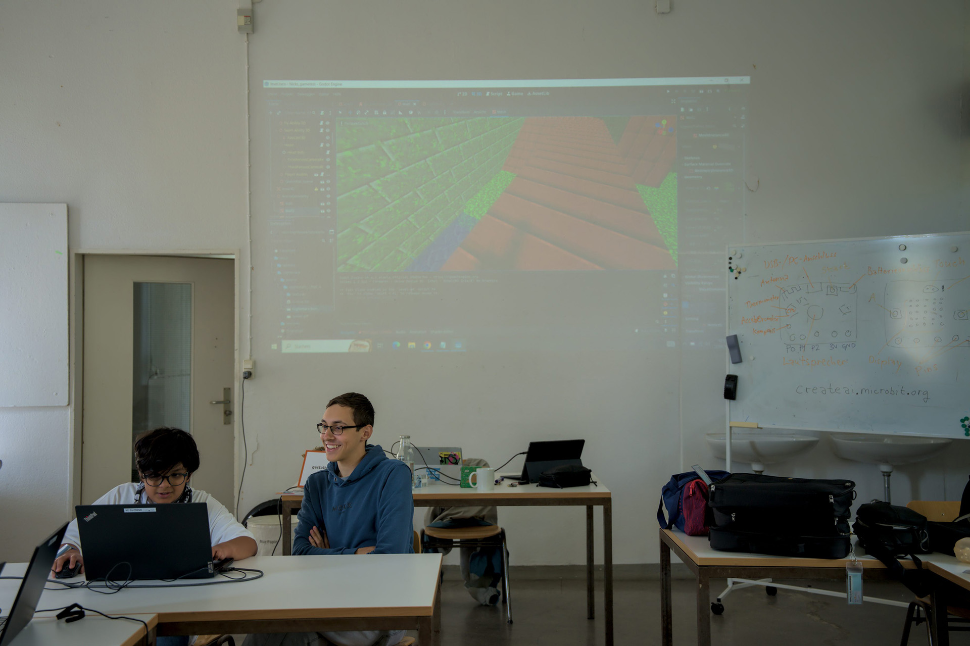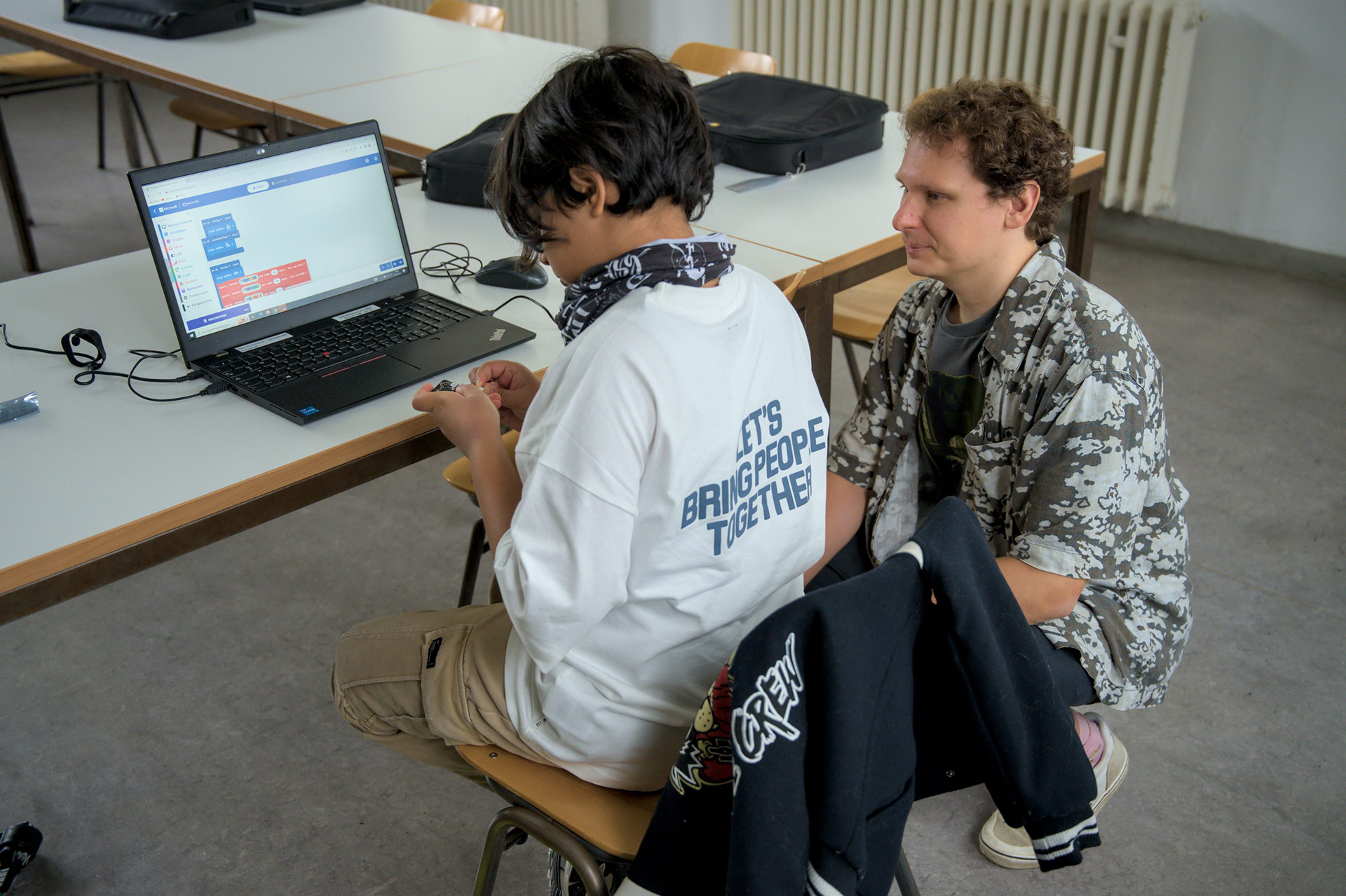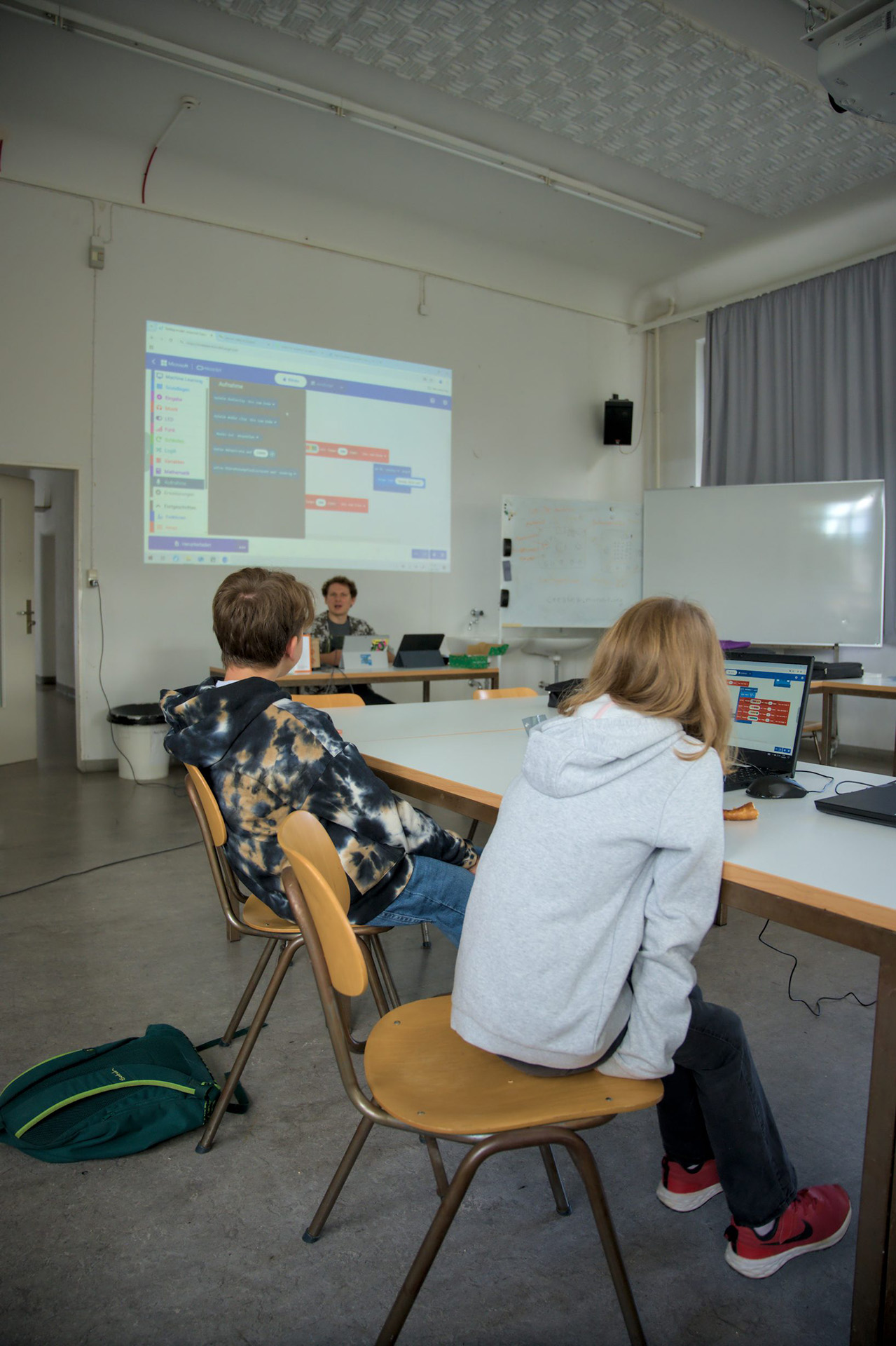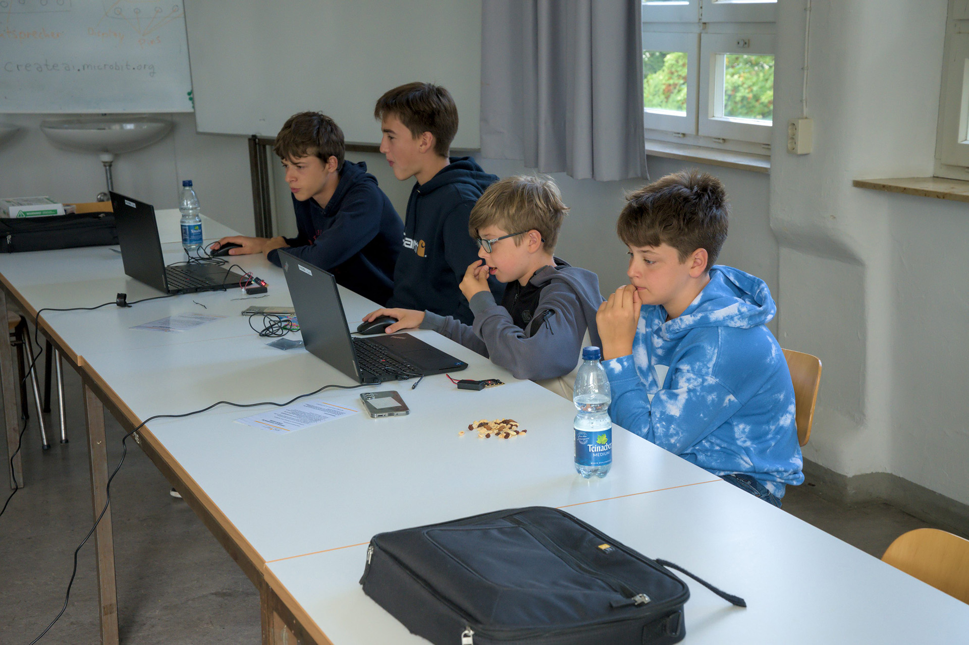 Dieses Mal ging es darum, eine KI zu trainieren. So sollte der Micro:bit „lernen“, wann man ihn schüttelt oder winkt, boxt oder tanzt. Sobald er die Bewegung erkannt hatte, zeigte er verschiedenste Symbole an. Daraus entstand ein kleines „Simon says“, bei dem das Gerät einem sagte, was für eine Bewegung man machen sollte. Durch das „Lernen“ der KI, wusste sie, ob man alles richtig gemacht hat oder nicht.