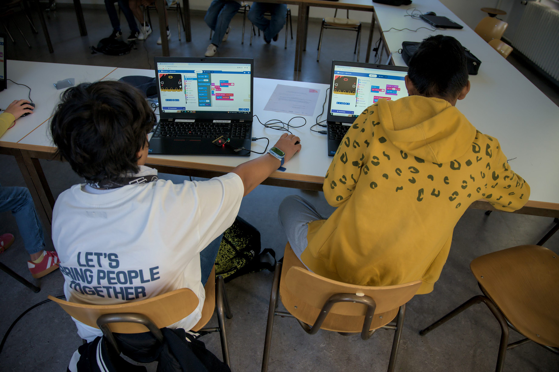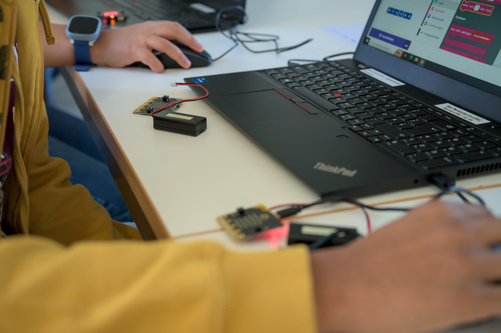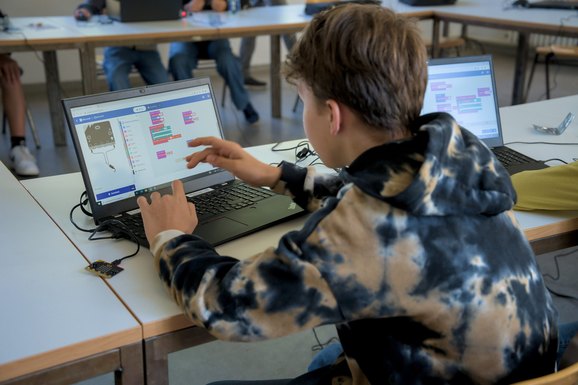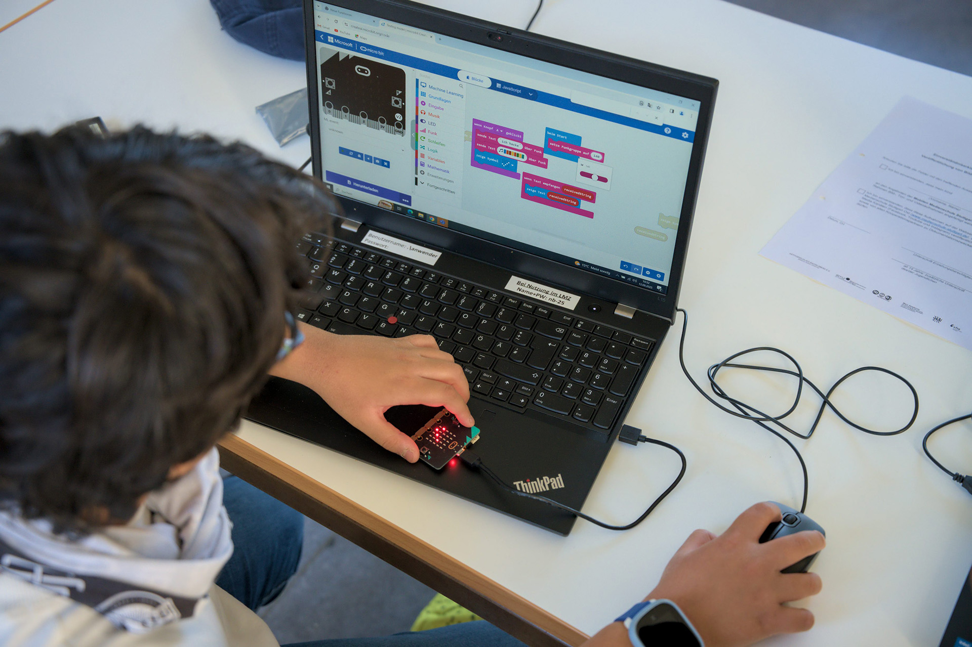 Vom 11. bis 12. September haben an der Merz Akademie Kinder mit Micro:bits programmiert. Diese unscheinbaren kleinen Controller können dabei ganz schön viel. Unter anderem Sprechen, Bewegungen erkennen, Funken oder auch über einen Bildschirm Smileys und Wörter anzeigen.