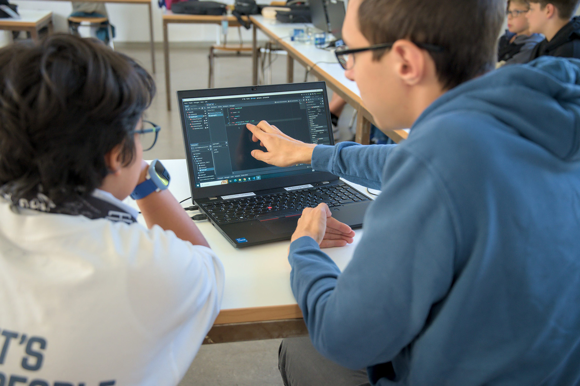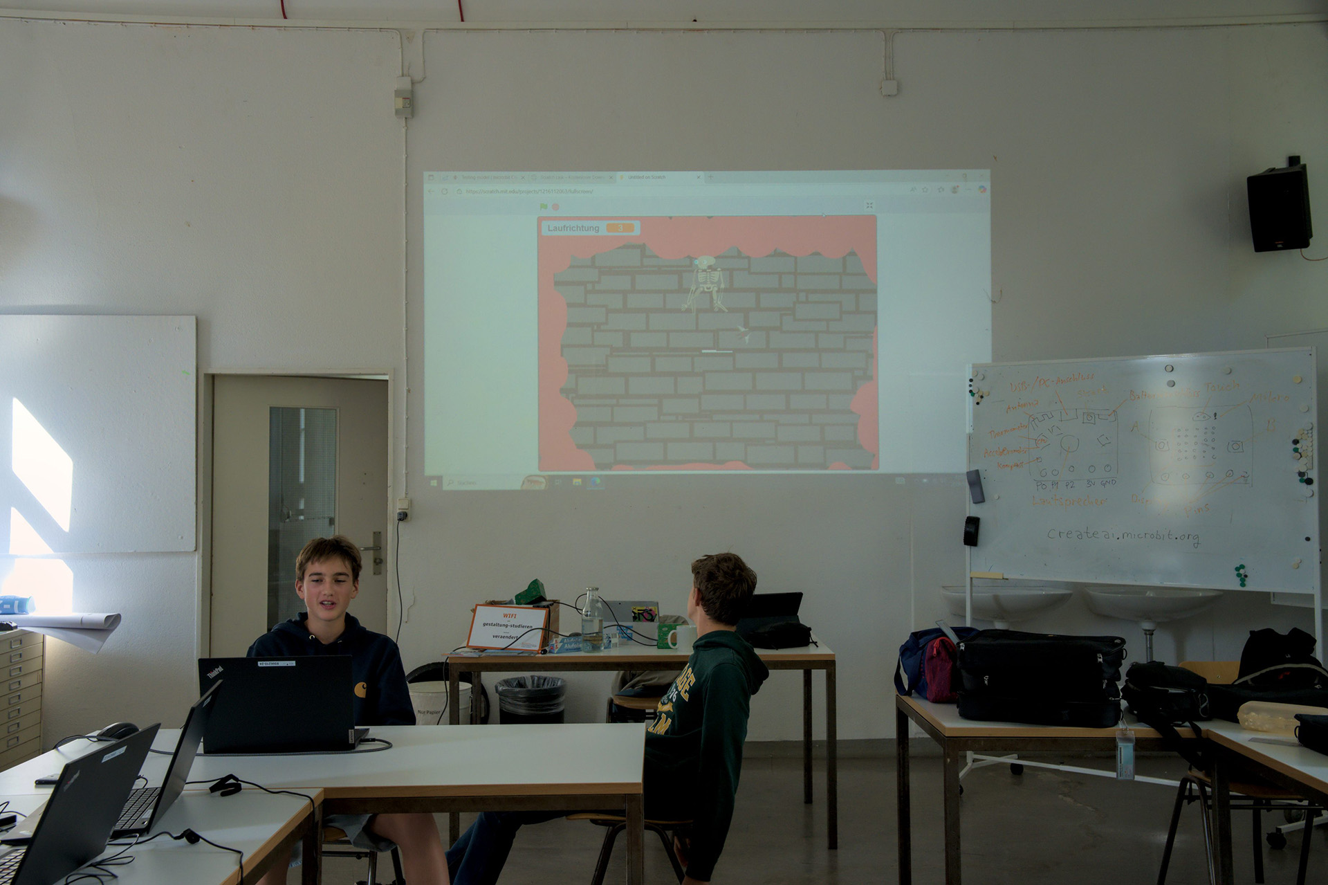 Am zweiten Tag wurde ein weiteres Tool der Controller benutzt. Das Funken. So konnte man von Micro:bit zu Micro:bit Zahlen, Wörter und sogar Bilder und kleine Animationen senden. Zum Schluss konnten die Kinder das Wissen nutzen und zum Beispiel kleine Spiele zu erstellen. So entstanden dann Projekte, wo man mit den Knöpfen des Controllers Flappy Bird spielen, oder durch schütteln und neigen eine Figur bewegen lassen konnte.